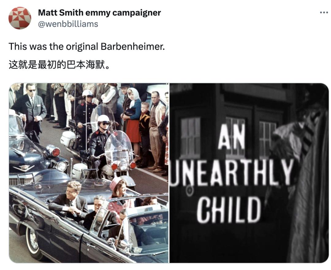 芭比的首映式是 7 月 12 日,奥本海默的首映式是 7 月 13 日。于是有人列出了 1963 年 11 月 22 日遇刺的肯尼迪,与 1963 年 11 月 23 日播出的《神秘博士》第一部连续剧《 An Unearthly Child 》。