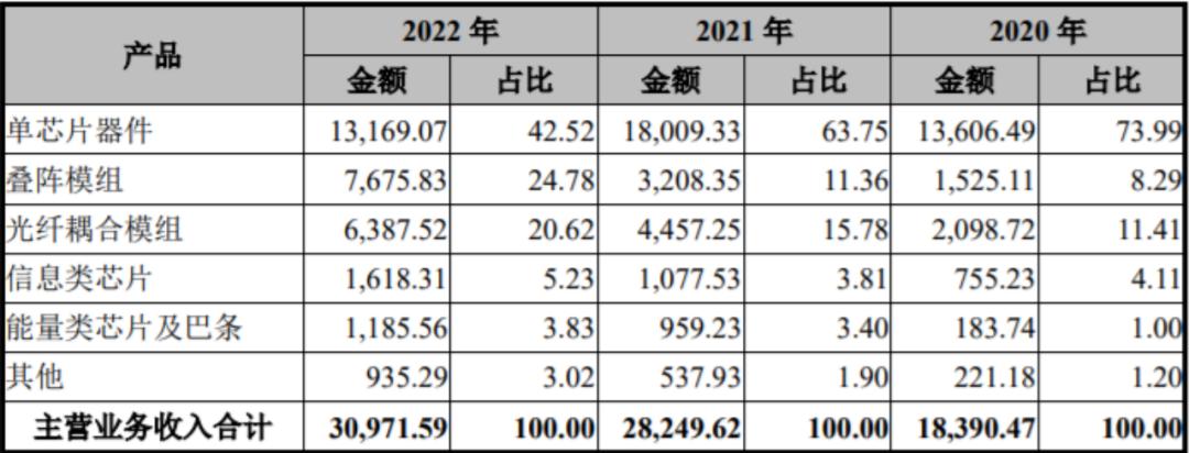 从招股书也能看到,「华光光电」的第二曲线——模组业务增长迅速。2020年占比还只有20%,2021年增长至27%,2022年达到45%,一举超过单芯片器件业务。