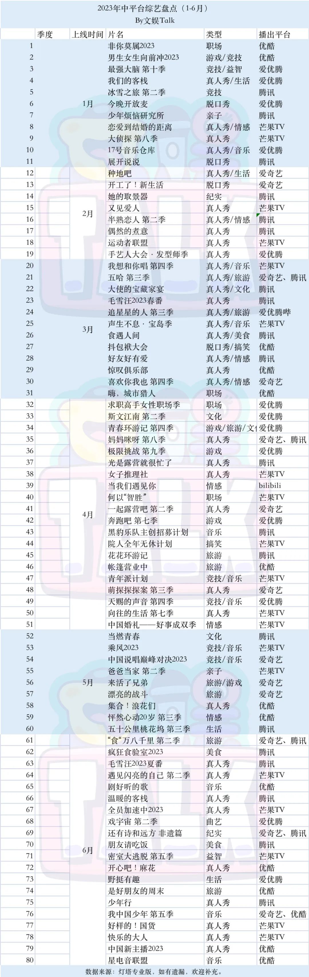 上半年腾讯综艺虽然缺失头部节目,但主打的就是一个上新数量多,尝试方向广,由点到面先试了再说,看起来下半年的策略也不会发生大的变化。该说不说,还有点期待《舞台2023》能不能成为腾讯下一个跑出来的节目。