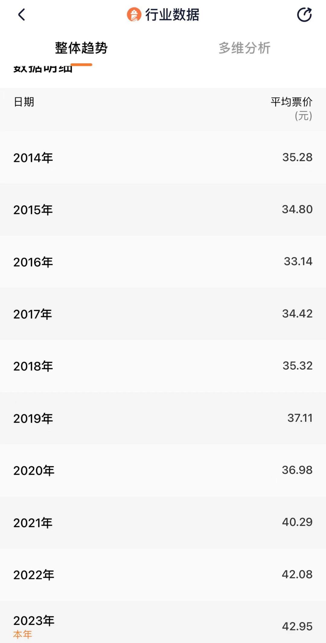 灯塔专业版显示,今年以来,平均电影票价为42.95元,为2014年以来的新高。其中,2019年平均票价为37.11元,到了2020年,平均票价降为36.98元。2021和2022年,电影平均票价均突破40元,分别为40.29元和42.08元。