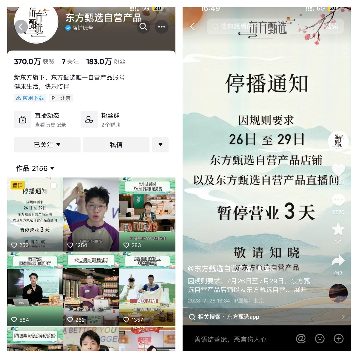 东方甄选抖音自营产品店铺被关,将转战App直播三天丨最前线