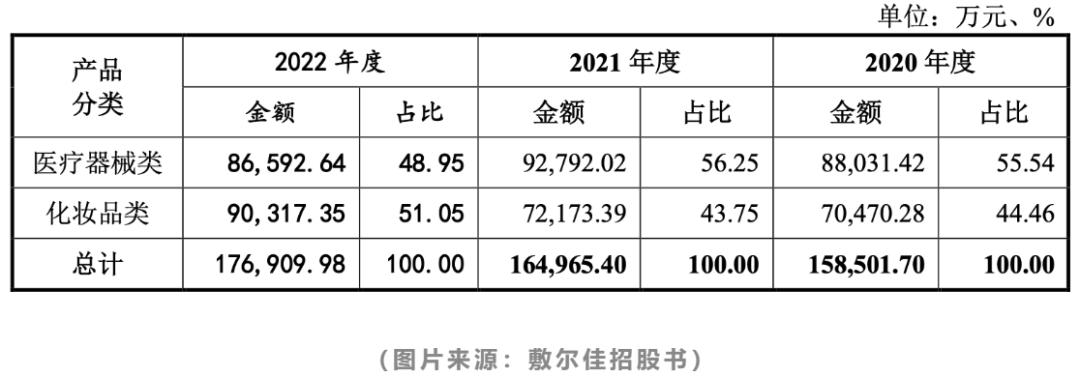 虽然拳头产品销量口碑俱佳,但在22年公司整体收入上涨的情况下,医疗器械类产品的金额占比却不如前两年,甚至首次降到50%以下。敷尔佳在招股书中将此解释为“公司为响应市场和消费者需求,不断上市销售化妆品类护肤品,化妆品类产品收入和占比不断增加所致”。但仔细阅读财报数据,却会发现,22年敷尔佳医疗器械类收入8.66亿元,为近三年来最低,敷尔佳将此下滑解释为“宏观经济波动等因素影响,医疗器械类产品的终端销售渠道及物流运输受到一定程度影响 ”,这样的说辞恐怕很难解释真实原因。结合敷尔佳化妆品类产品的扩充和推广,明眼人很容易看出来敷尔佳的担忧:械字号“医美面膜”的故事很难再继续讲下去了。