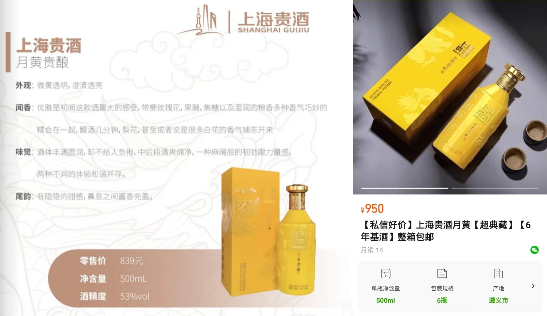 新消费财研社注意到,天青贵酿在官网标价为1599/500ml,但在淘宝、京东等线上平台上最低仅折合400多元/瓶;在官网售价839/500ml的上海贵酒·月黄贵酿,网购价格可以低至950/件。