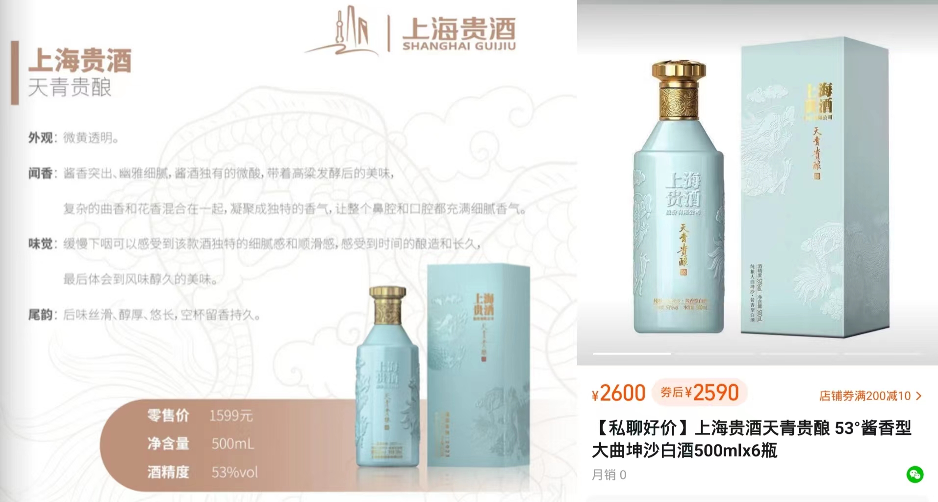 在一定程度上,“酱酒”是高端白酒的代名词。上海贵酒的营收主要靠中高端白酒酱酒,其中高端酱酒代表品牌“天青贵酿”,在官方宣传口径中零售价高达1600元/瓶,甚至超过了飞天茅台。但上海贵酒的高端和次高端单品,在市场中却存在严重价格倒挂的现象。