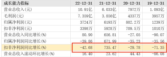 而与始终强劲增长的营收相比,岩石股份的盈利能力则有些“拉胯”。数据显示,在过去四年中,有三年的利润增速为负。截止2022年末,岩石股份实现扣非净利润3398万元,较去年同比下降42.68%,深陷增收不增利怪圈。