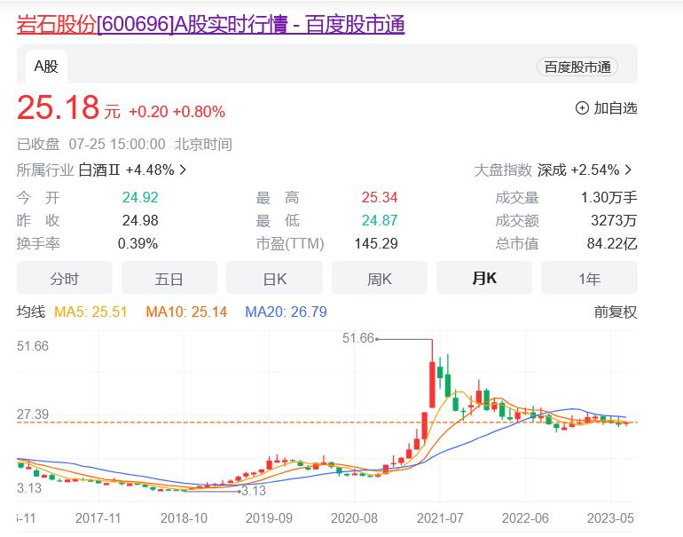在多年的发展过程中,从陶瓷业到房地产业再到互联网金融,岩石股份涉足多个“风口”行业后,于2019年踩着酱酒的风口崛起,股价业绩增长迅猛,被业内冠以“酱酒黑马”之称。