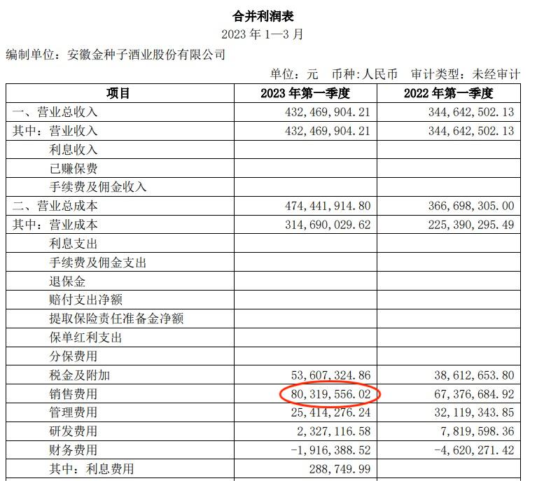 事实上,如此高额的营销费用,在同营收梯队的白酒企业中极为少见。举例来看,安徽金种子酒2022年总营收为11.86亿元,2023年一季度营收为4.32亿元,与岩石股份的营收大致接近。2023年一季度其销售费用为8031万元,比岩石股份的销售费用足足少了一半。
