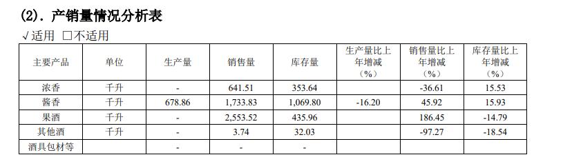 2022年报显示,在岩石股份主营的浓香、酱香、果酒与其他酒中,只有酱香酒记录了678.86千升的生产量,其余三类皆是有销量而无产量。