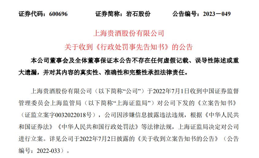 近日,上海证监局的一纸《行政处罚事先告知书》,将上海贵酒股份有限公司(600696.SH,下称“岩石股份”或“上海贵酒”)再次推到了聚光灯下。