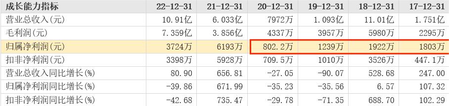 根据财报, 2017-2020年,岩石股份的归属净利润分别与约为1803万元、1922万元,1239万元、802.2万元。如果将代偿费用算入,那么岩石股份这四年的利润就分别约为-153.93万元、192.5万元、-792.1万元、-508.11万元。