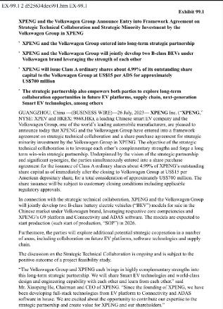 大众汽车表示,交易完成后,大众汽车集团将获得一个小鹏汽车董事会观察员席位。股份发行将取决于惯例交割先决条件的达成,包括适用的监管审批。