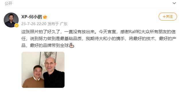 而小鹏汽车对于这样的合作应该也是期盼已旧,何小鹏在微博上晒出他和贝瑞德的合照,并表示“这张照片拍了好久了,一直没有放出来。今天官宣,感谢Ralf和大众所有朋友的信任,说到努力做到是最基础品质”。