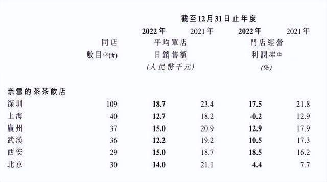 而结合奈雪的茶财报来看,其2021年、2022年每笔订单平均销售额分别为41.6元、34.3元,每间门店平均每日订单量分别为416.7单、348.2单;2021年、2022年门店经营利润为5.9亿元、4.7亿元,门店经营利润率为20.6%、11.8%。