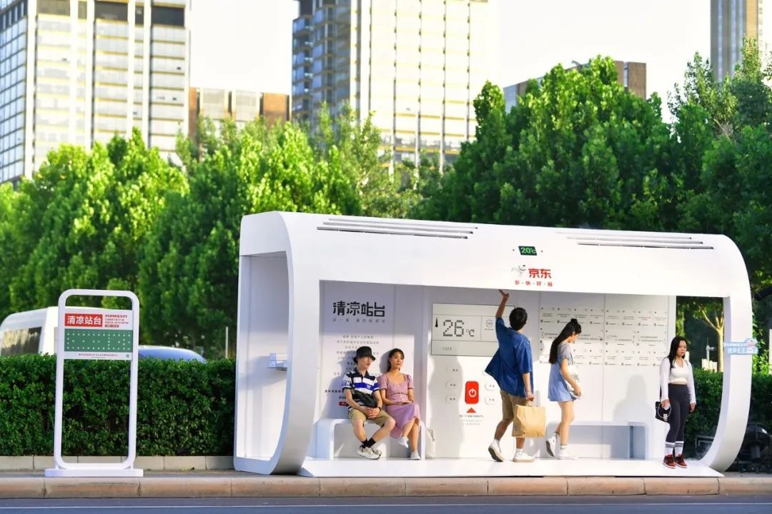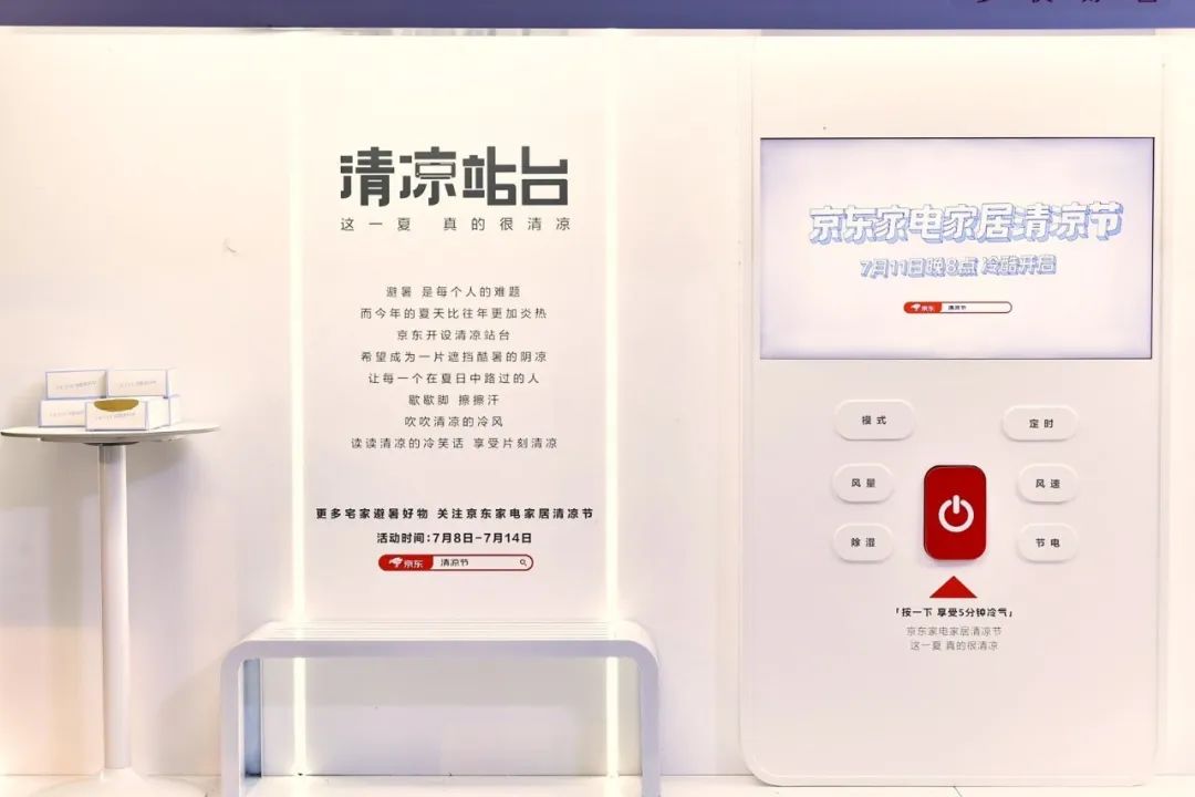 如此天气之下,行走于烈日下成为了一大难事。京东家电家居则打造了一个清凉站台,为人们带去一丝冷气。