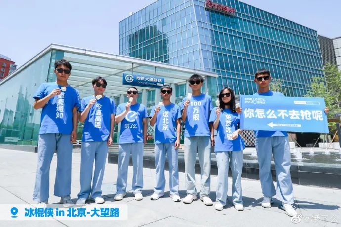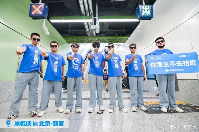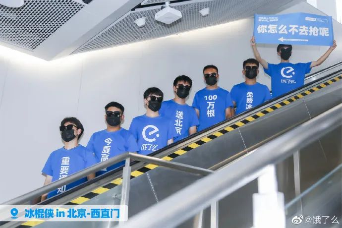 在线下营销方面,饿了么还在北京的几个地铁站内派遣“冰棍侠”。整齐划一的“饿了么蓝”让人自然接收到凉爽的气息,这些冰棍侠也在站内分发真正的凉爽:100万根免费冰棍儿。当最高气温达到36度,就会有冰棍侠出现。