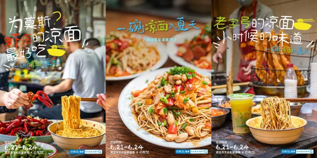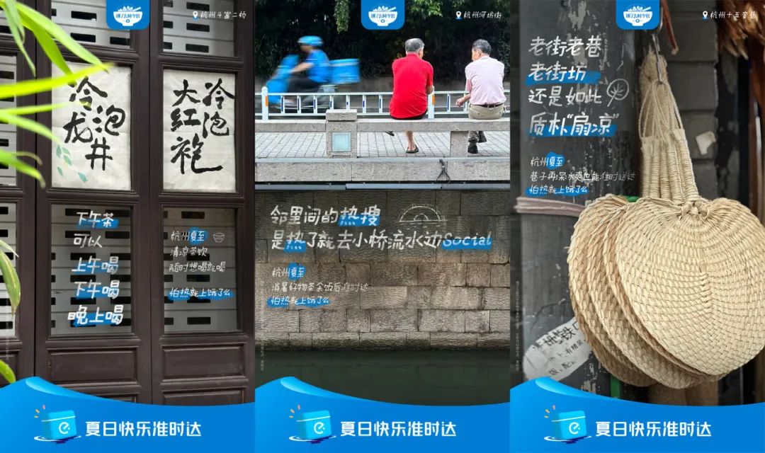 此外,在夏至时节,饿了么还打造城市清凉活动。不仅与武汉市文化和旅游局联合开启“一碗凉面入夏天”活动,还发布杭州消暑秘籍系列海报, 通过当地方言和趣味文案将平台与城市链接深入用户心智。