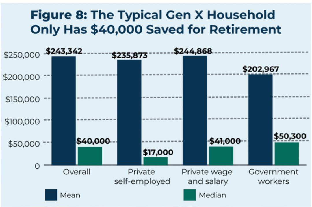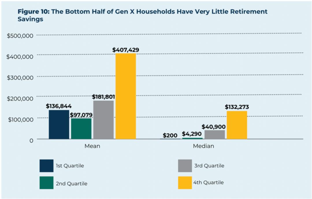 这个数字应该给任何关心退休保障的人敲响警钟,因为这个水平的退休储蓄每月只能提100-150 美元的退休收入。作为在私营部门取消养老金后进入劳动力市场的第一代人,X代人的储蓄问题预示着千禧一代及其后几代人在退休储蓄方面将面临更严峻的挑战。