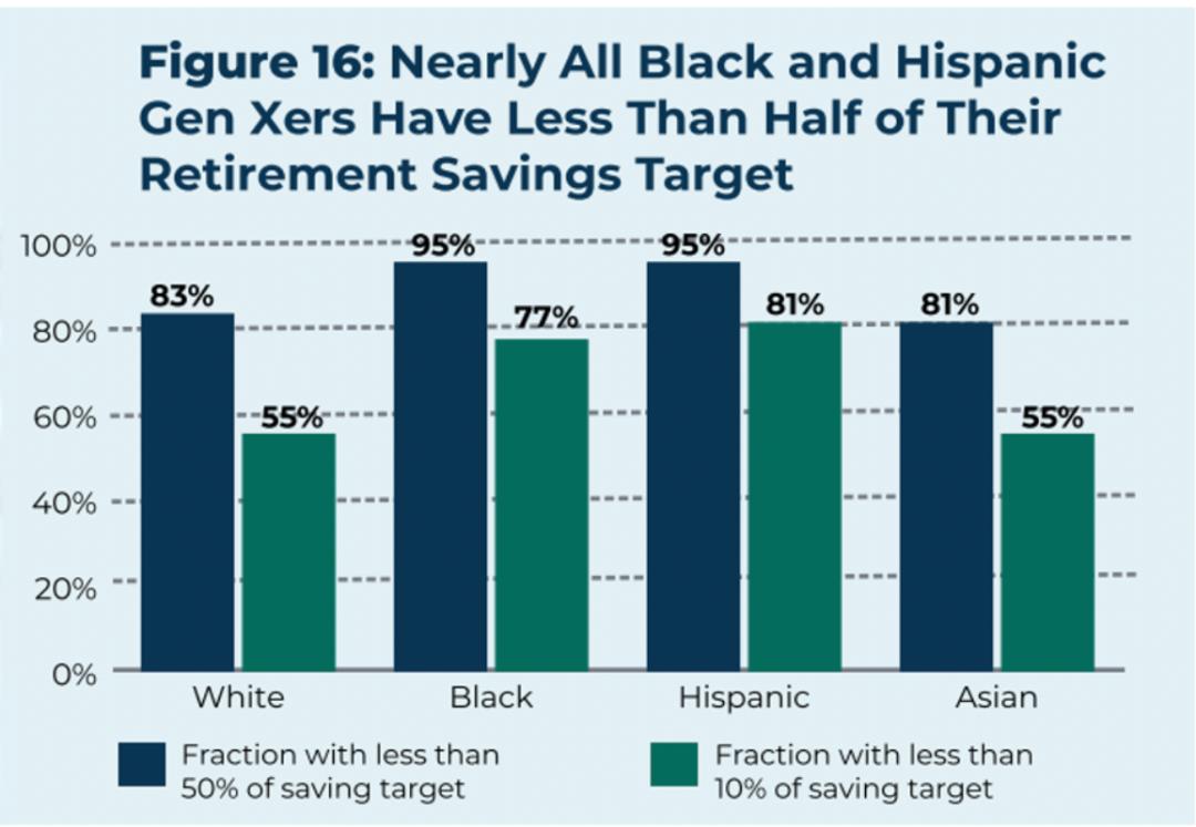 图16:几乎所有的黑人和西班牙裔X一代都不到退休储蓄目标的一半 国家退休保障研究所