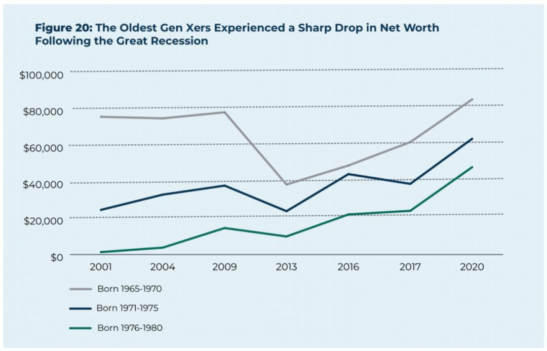 如果最年长的X代人没有经历经济衰退导致的净资产下降,他们现在的平均净资产可能会高得多,因为他们没有花十年的时间从重大损失中恢复过来,而是一直在增加净资产,提高资产价值。人生在世,时机很重要,与他们的前辈婴儿潮一代相比,X代人的运气很差。