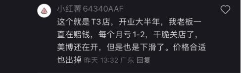 有知情人士在某闭店帖子下面表示,他所在的门店,老板一直在赔钱,每月都得亏1-2万元,所以干脆关店了。据他描述,这位老板的另一家门店虽然暂时还没闭店,但杯量和营收也在下滑,正等待有缘人给出合适的价格“接盘”。