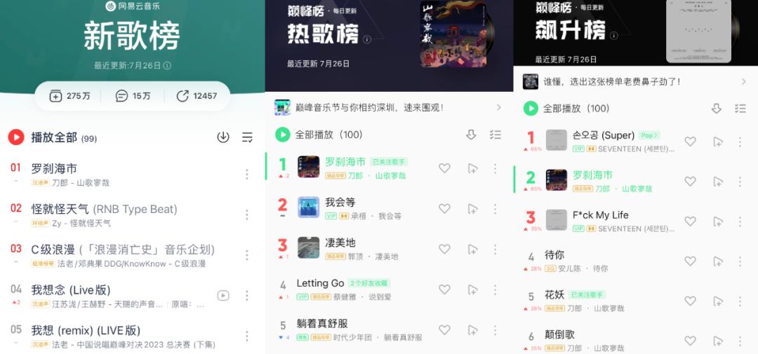 据音乐平台数据显示,近日《罗刹海市》和刀郎接连冲到了QQ音乐、网易云音乐热搜词条的前三名。此外,这首歌同时登上了网易云新歌榜第1名、QQ音乐新歌榜第1名和QQ音乐热歌榜第1名,并带动刀郎新专辑里的《花妖》《颠倒歌》《路南柯》《画壁》《画皮》皆攀至QQ音乐飙升榜TOP20。