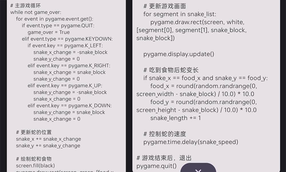 比如让它写一个“贪吃蛇”游戏的代码,它会给出基本的代码结构,并且会给你一些提示和建议。