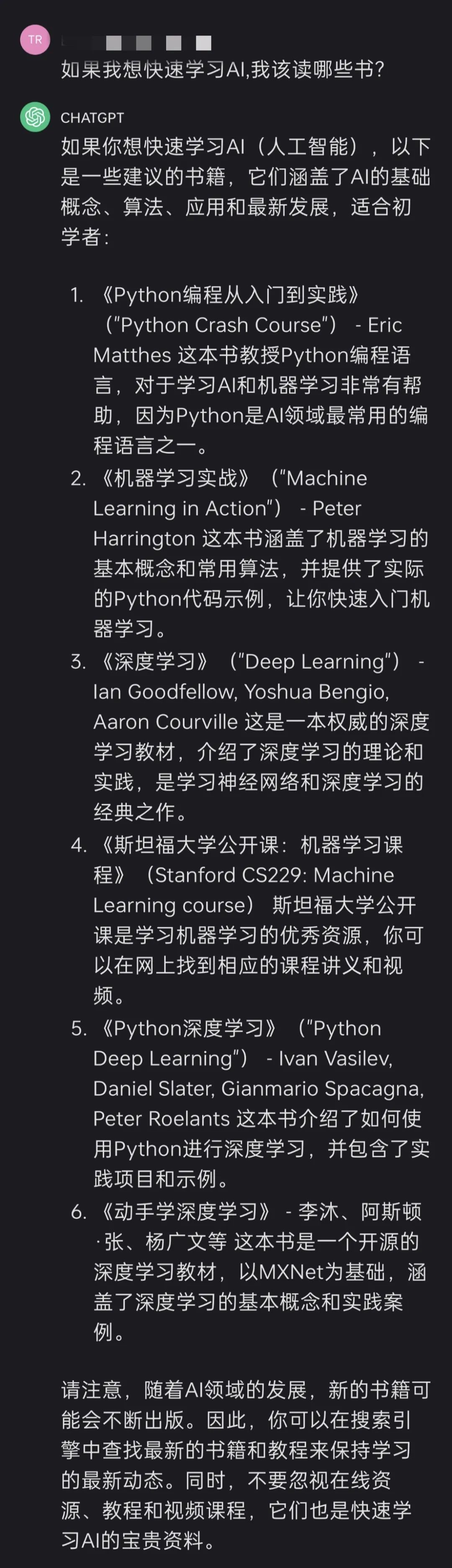 比如针对想要快速学习AI知识的人,提供一些阅读书目建议: