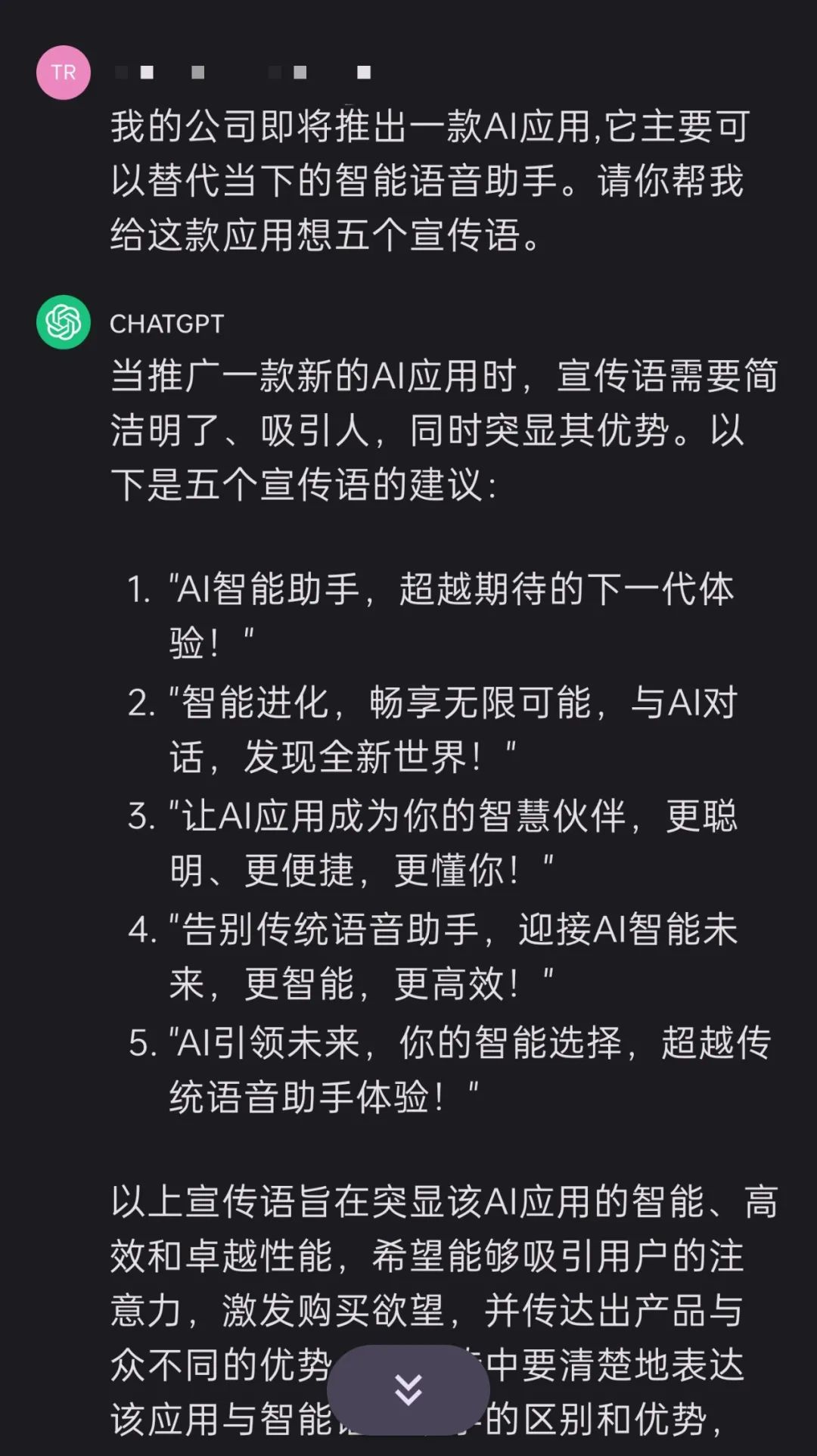 比如给一家公司将要推出的AI应用想五条宣传语:
