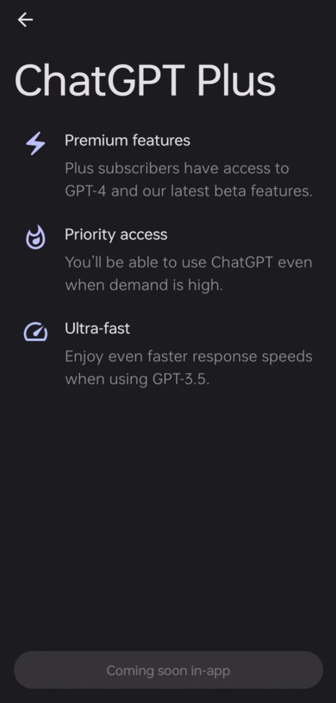 登陆后,App会自动识别我是否是付费用户,如果我是ChatGPT Plus用户,App的主界面上方就会有两个选项框,供我选择是用GPT-3.5还是GPT-4,免费用户没有选项,只能使用GPT-3.5。安卓版ChatGPT并没有开放ChatGPT Plus的购买选项,后续预计将会开放。