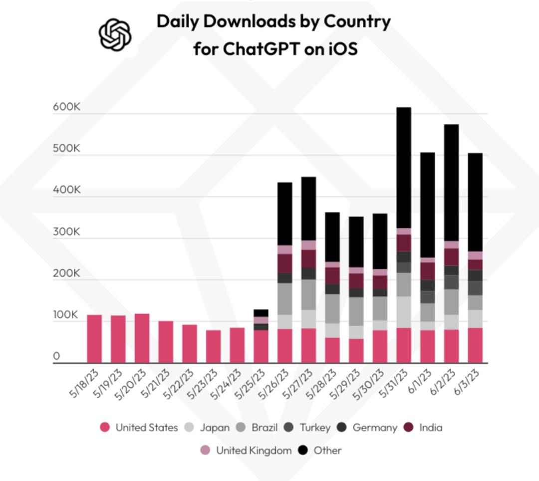 ▲iOS版ChatGPT日下载量变化趋势(按国家/地区),来源:Data.ai