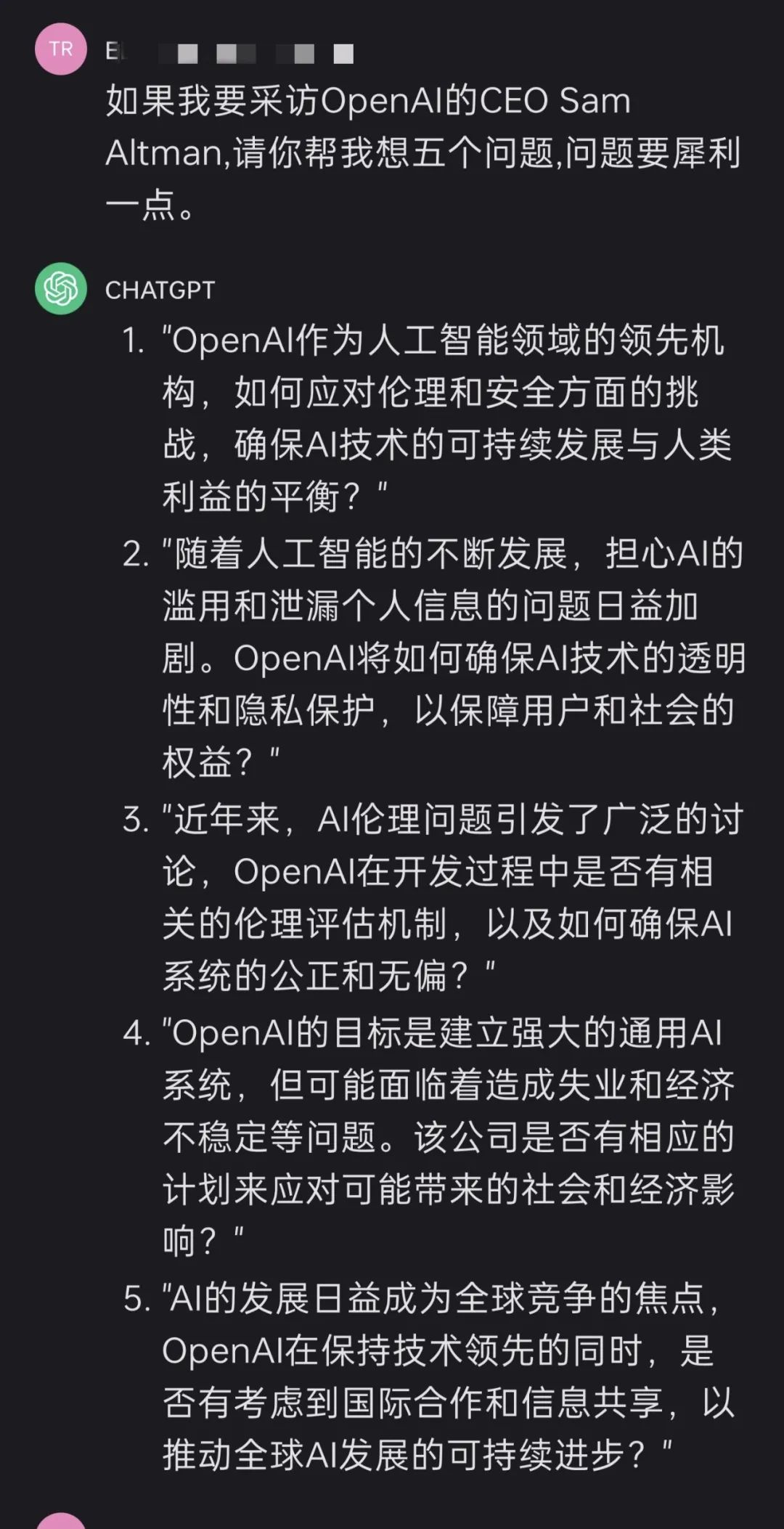 比如针对OpenAI CEO的采访,给出几个参考提问: