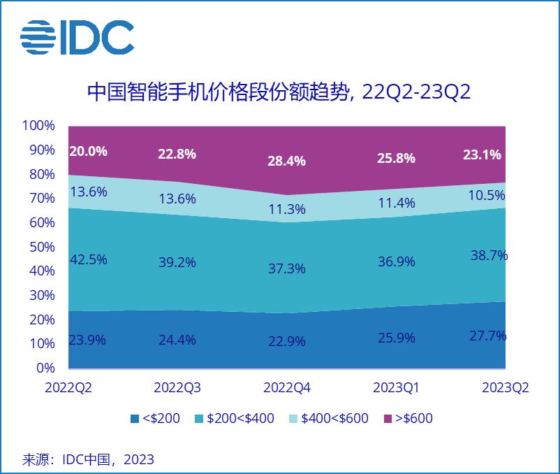 具体来说,高端手机(大于 600 美元——约合人民币 4288 元)份额从去年同期的 20%涨到了今年第二季度的 23.1%,入门级手机(小于 200 美元——约合人民币 1429 元)分份额则从 23.9%扩大至 27.7%。