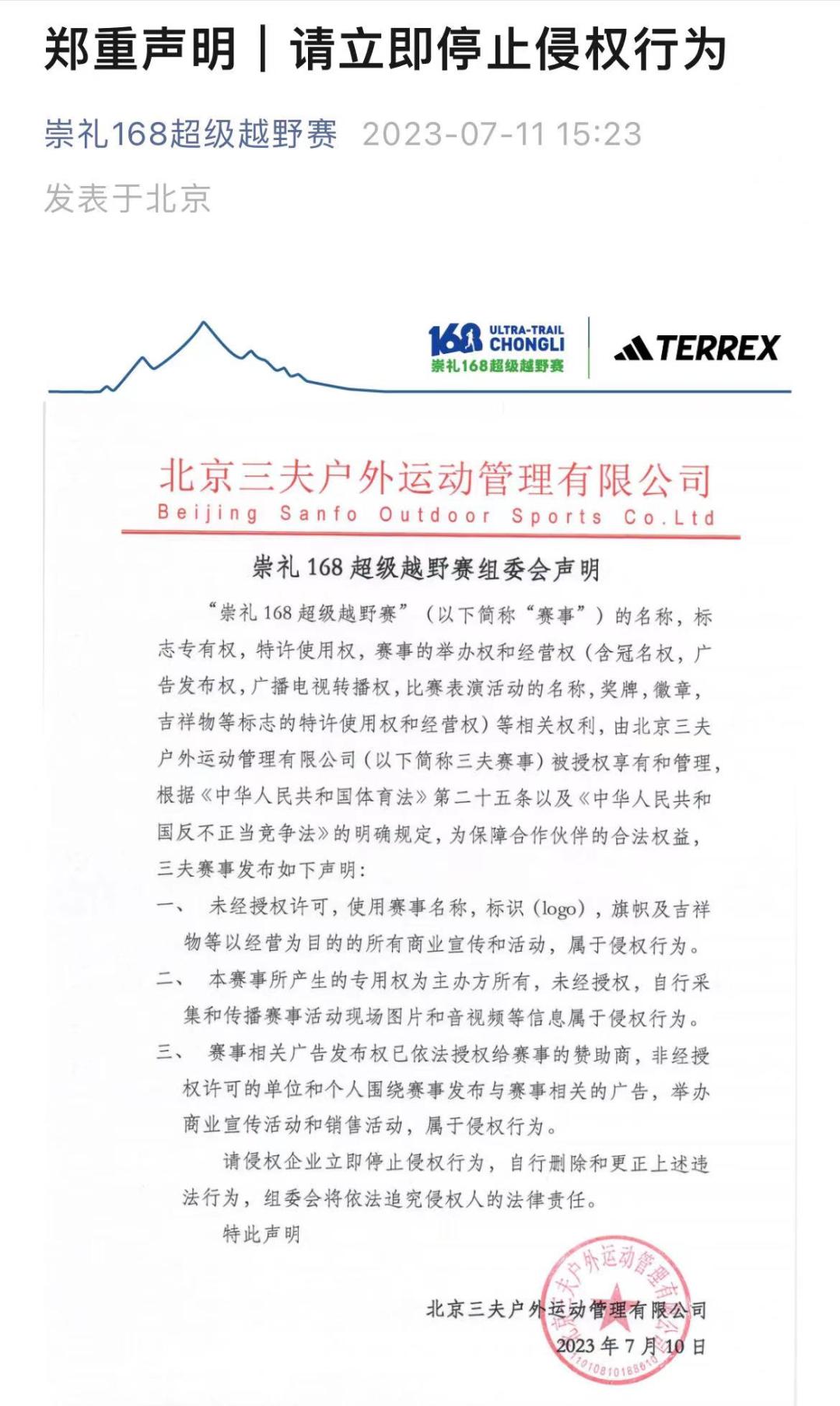 赛事主办运营方三夫户外对此不满,活动结束后在168的官方公众号发表声明,要求相关户外运动品牌停止侵权行为。声明发出后,这些品牌大多都删掉了活动前招募战队的推送。与此同时,这份声明也在越野跑赛事圈里引起争议。本文针对这类行为进行相关法律分析,希望能给未来围绕各大型体育赛事的营销,提供可借鉴的合规思路。