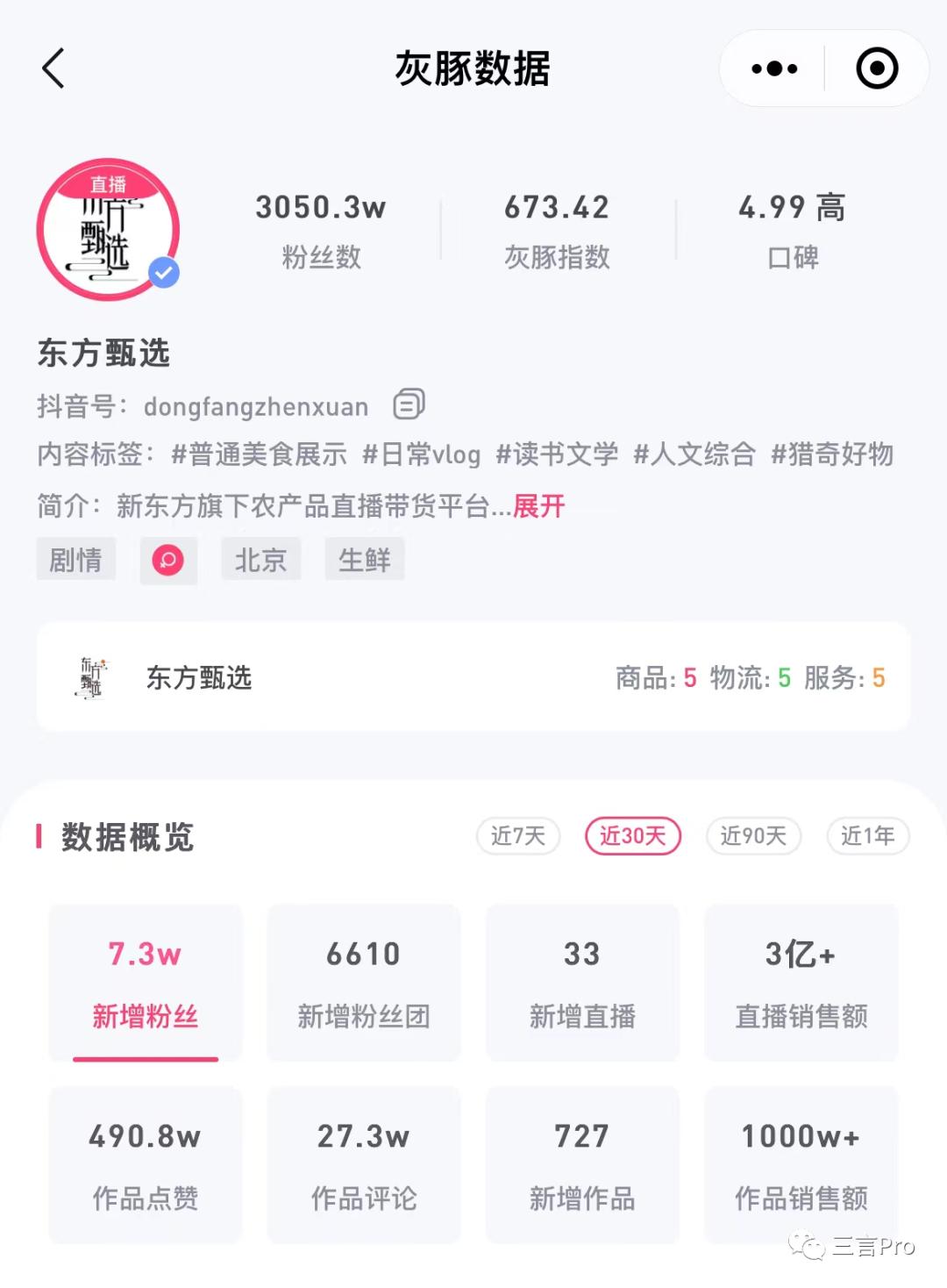 而东方甄选主号近30天的直播销售额超过3亿元,占抖音电商销售额的3‰,所以如果东方甄选出抖后,应该不会对抖音造成太大影响。