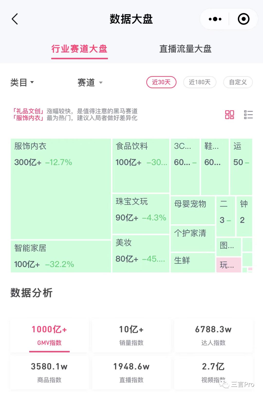 据灰豚数据显示,抖音近30天行业大盘GMV指数超过1000亿。