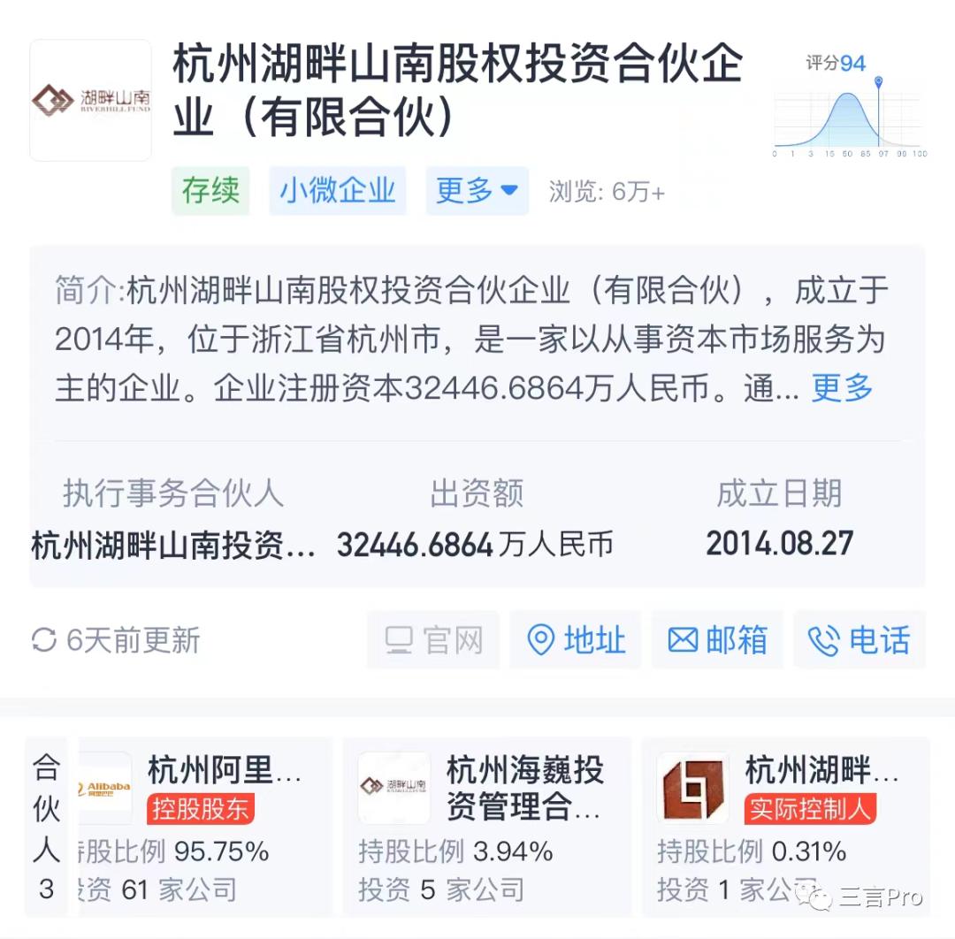 而杭州湖畔山南股权投资合伙企业(有限合伙),是一个阿里系企业。大股东为杭州阿里创业投资有限公司,持股比例95.75%。