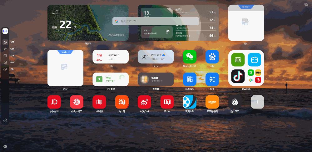 因为它可以让你原本平平无奇的浏览器主页面,变成这样由各种小组件构成的界面,它甚至还带有 Dock 栏,看起来就像是一个完整的桌面: