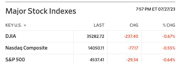 截至收盘,道指终结自1987年以来最长的连涨纪录,跌幅为0.67%;纳指跌幅为0.55%;标普500指数跌幅为0.64%