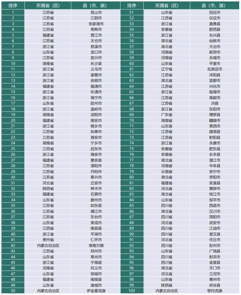 东南沿海地区是“百强县”集中地。最新“百强县”名单中,东部地区占据65席,数量与2022年保持一致;中部地区减少2个,占20席;西部地区新增4个,有14个入围;东北地区数量较前两年减少2个,仅剩瓦房店市还在榜上。