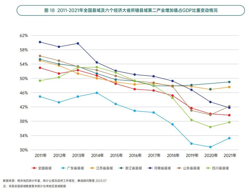 以广东、江苏、浙江、河南、山东、四川六个经济大省的县域二产作具体分析。2011-2021年,六省所辖县域二产增加值占GDP比重均呈下降趋势,甚至在2014年到2020年期间,广东、河南、山东、四川四省还呈现出加速下降的趋势。