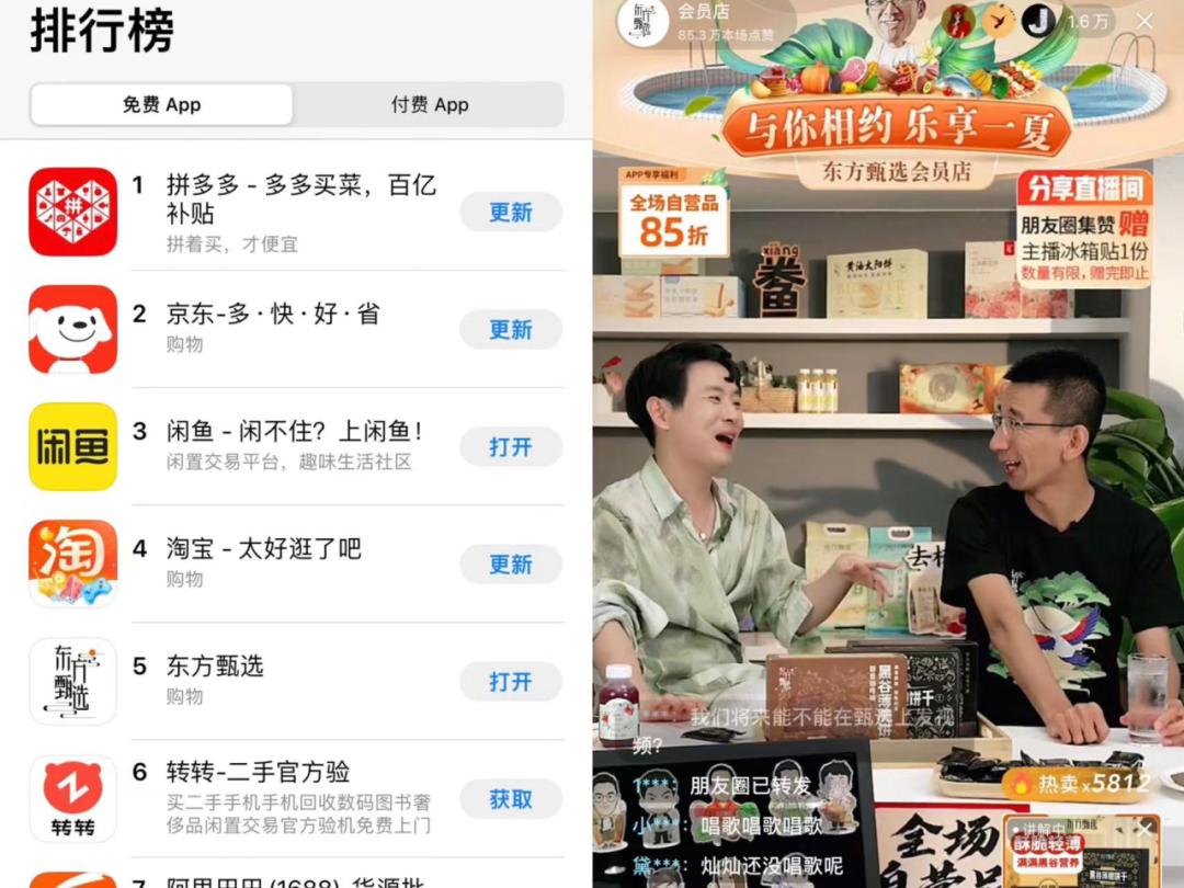 7月27日,东方甄选APP一度冲到IOS免费购物榜第五。在当晚的直播中,东方甄选APP上开播的有两个直播间,分别是“东方甄选会员店”和处于此次事件漩涡中心的“东方甄选自营产品”。截至晚间十点半,东方甄选APP的总GMV已经突破3000万。