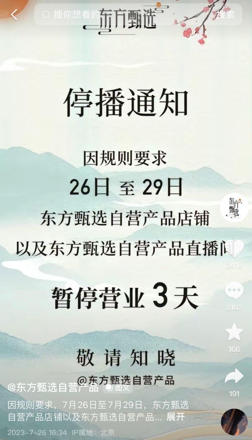 很快,东方甄选的抖音自营产品账号贴出公告称,“因规则要求,7月26日至7月29日,东方甄选自营产品店铺以及东方甄选自营产品直播间,暂停营业3天。”