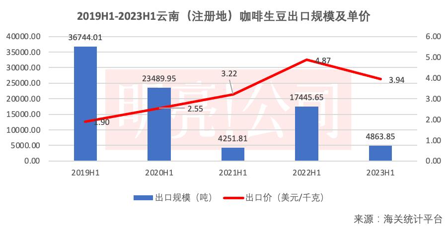 但也有一种可能,即未来2-3年中国咖啡生豆的供给、消费继续按每年30%的增速增长,至少从云南咖啡生豆的出口数据上来看,情况是乐观的。今年上半年,云南咖啡生豆出口量为4863.85吨,这一数字较2019、2020、2022年同期明显降低,仅略高于2021年,这或许说明了云南的咖啡豆正在越来越多地被国内消费。