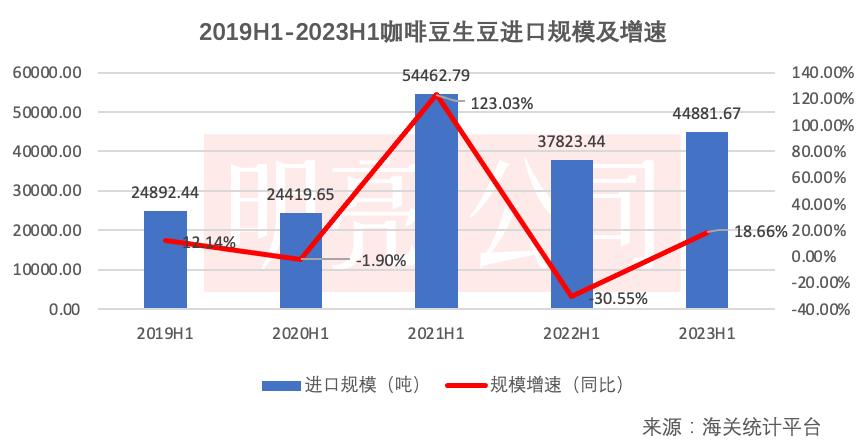 海关统计平台数据显示,今年上半年的咖啡生豆进口规模约为44881.67吨,同比增长18.66%,相较2021上半年高峰时期123.03%的增速,已进入到平稳增长区间。据此前「明亮公司」统计,2022年中国咖啡豆进口规模为108260.30吨。