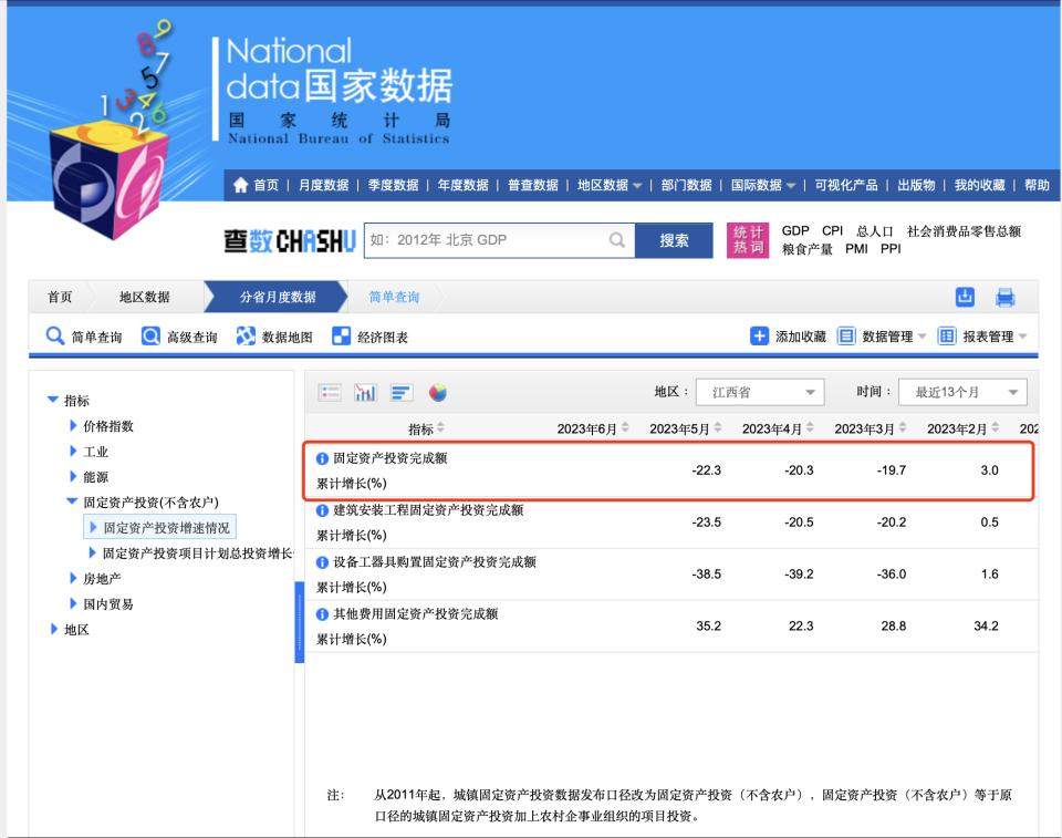 时代财经从国家统计局数据中心查询到,2023年2月,江西省固定资产投资完成额累计增长3%;3月份则降为为-19.7%;4月份为-20.3%;5月份为-22.3%;6月份数据未公布。