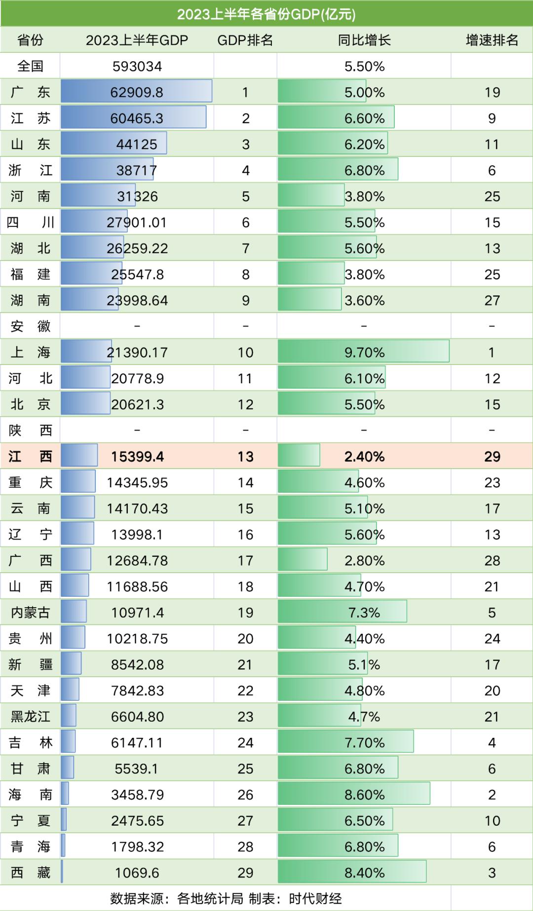 截至7月27日,除安徽、陕西外,其他29个省(自治区、直辖市)均公布了上半年经济数据,其中,14个省份地区生产总值(GDP)增速跑赢5.5%的全国水平。江西意外跌至底部,同比增速仅为2.4%,较全国5.5%的增速低3.1%个百分点,创10年来同期最低增速(除受疫情影响的2020年上半年外)。