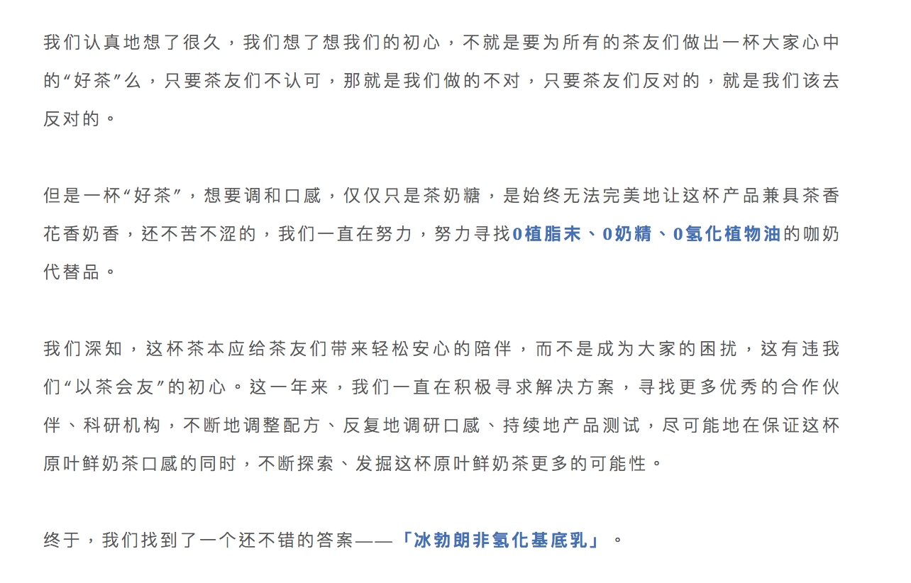 需要认识到,此次基底乳的全面革新,并不是配方与口感的改变。原叶鲜奶茶系列的主要成分仍然是茶汤和优质牛乳,每杯原叶鲜奶茶产品里约加入20ml-40ml左右的“冰勃朗”,使茶香与乳香达成更充分的交织融合,最终实现了原叶鲜奶茶系列产品“0奶精、0植脂末、0氢化植物油”的健康化升级。