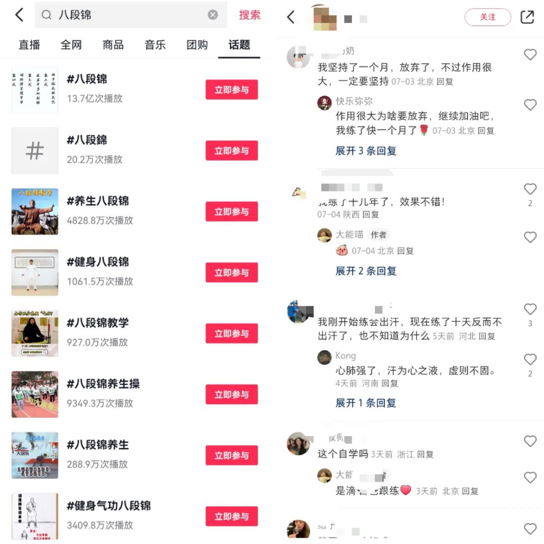 直到今年夏天,八段锦彻底火了,小红书、抖音很多用户突然成为八段锦的自来水,他们晒出练习八段锦的前后对比图,细数坚持过程中身体的种种变化,热情地推广此项运动,谢萌才开始将此事放在心上。