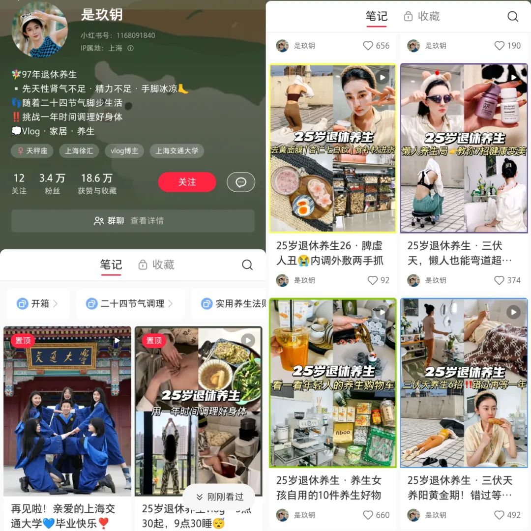 据新榜报道,新红数据显示,2023年上半年带有“养生”关键词的内容新增笔记超过93万,互动热度超过1.23亿。刺猬公社联系到今年4月开始经营小红书的养生博主@是玖钥,玖钥于4月30日发布第一篇视频“25岁退休养生vlog”,半年来涨粉超过3万。对此,玖钥表示:“我也很意外,没想到开始做自媒体,第一篇就爆了。”