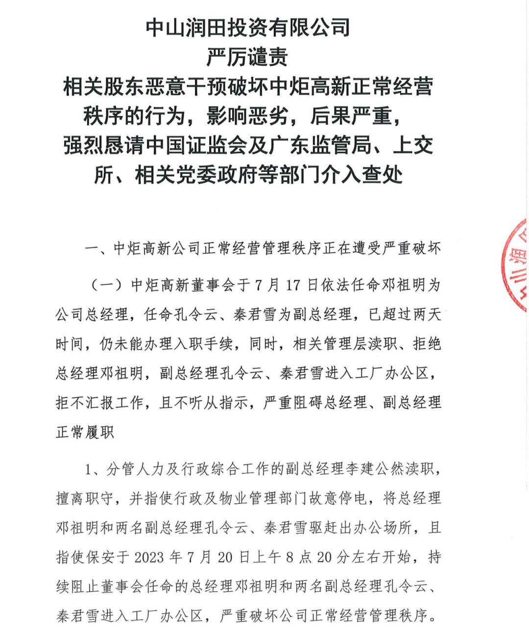 于是,7月20日,中炬高新股东、姚振华实控的中山润田在宝能集团官网发布声明,称“分管人力及行政综合工作的副总经理李建公然渎职,擅离职守,并指使行政及物业管理部门故意停电,将总经理邓祖明和两名副总经理孔令云、秦君雪驱赶出办公场所,且指使保安持续阻止三人进入工厂办公区。